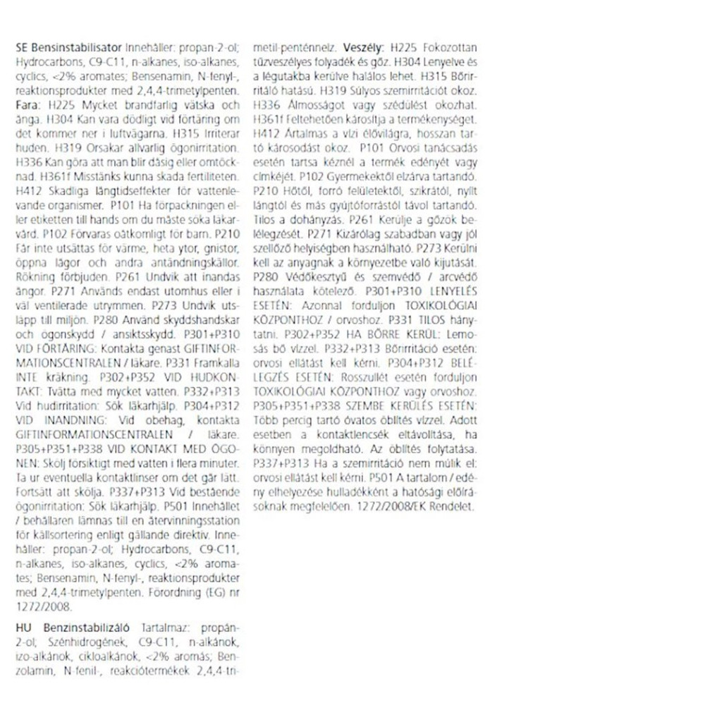 • Javítja az Indítási Tulajdonságokat: A stabilizált üzemanyag hosszú tárolás után is megtartja gyúlékonyságát. Ezáltal a motorok (beleértve a ritkán használt oldtimereket és hajókat is) a szezonális leállás után könnyebben indulnak és azonnal a megszokott teljesítményt nyújtják.