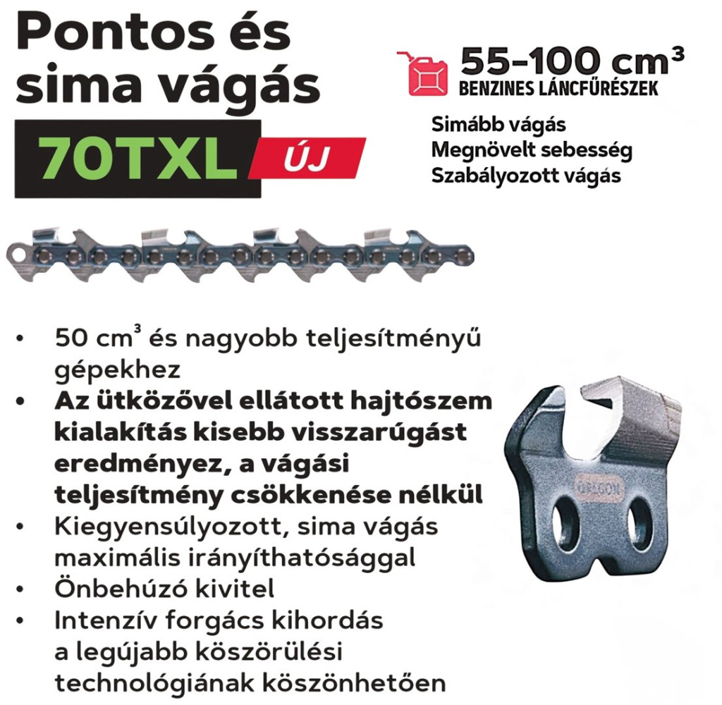 Ez a lánc a kategóriájában a legjobb vágási és darabolási teljesítményt nyújtja, miközben sima vágásképet és kiváló irányíthatóságot biztosít. Az ütközővel ellátott hajtószem kialakítása jelentősen csökkenti a visszarúgás veszélyét a vágási teljesítmény csökkenése nélkül, ami növeli a biztonságot és a komfortérzetet a munkavégzés során. Az önbehúzó kivitel megkönnyíti a vágás megkezdését, a lánc szinte „húzza magát” a fába, minimalizálva a felhasználóra nehezedő erőt.